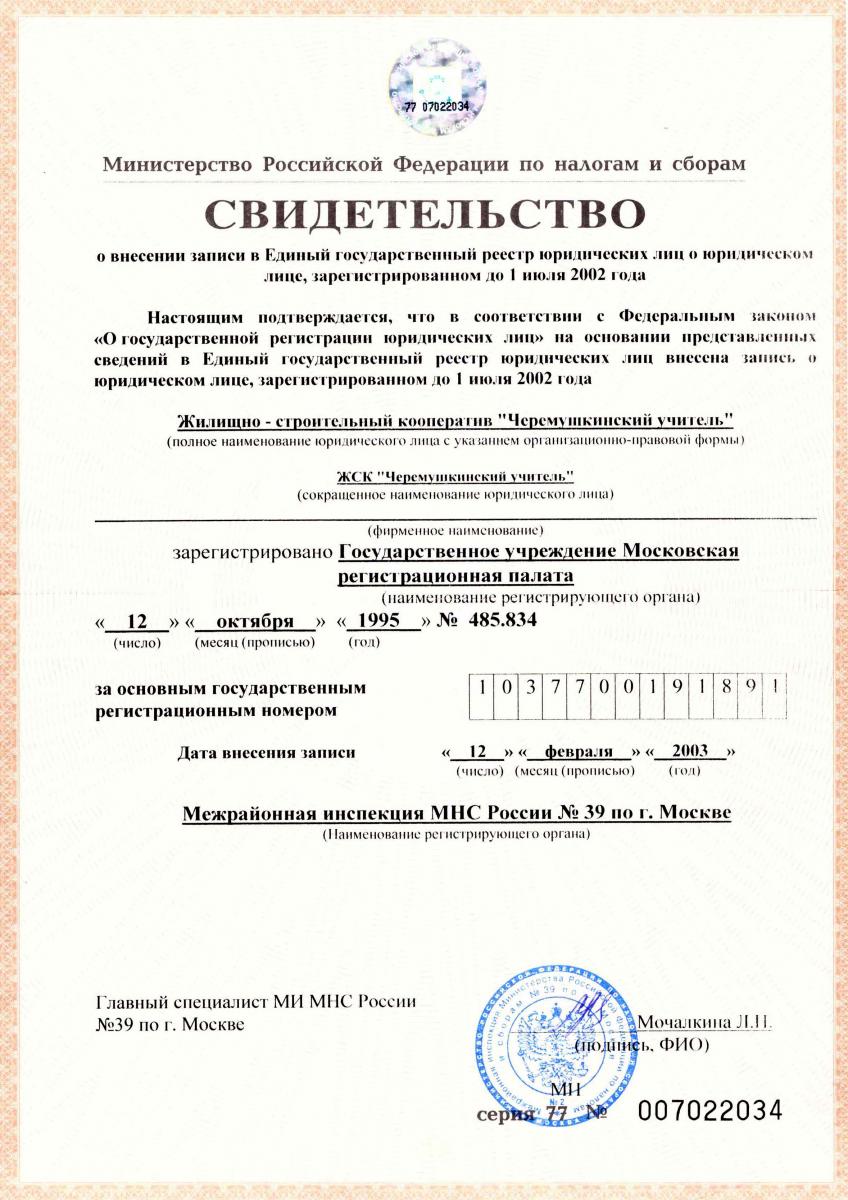 Свидетельство о внесении в ЕГРЮЛ (ОГРН)